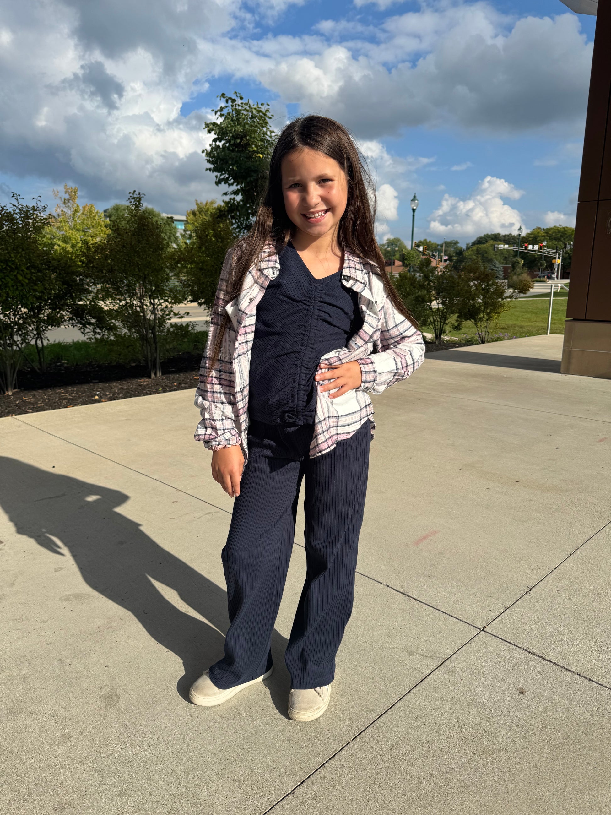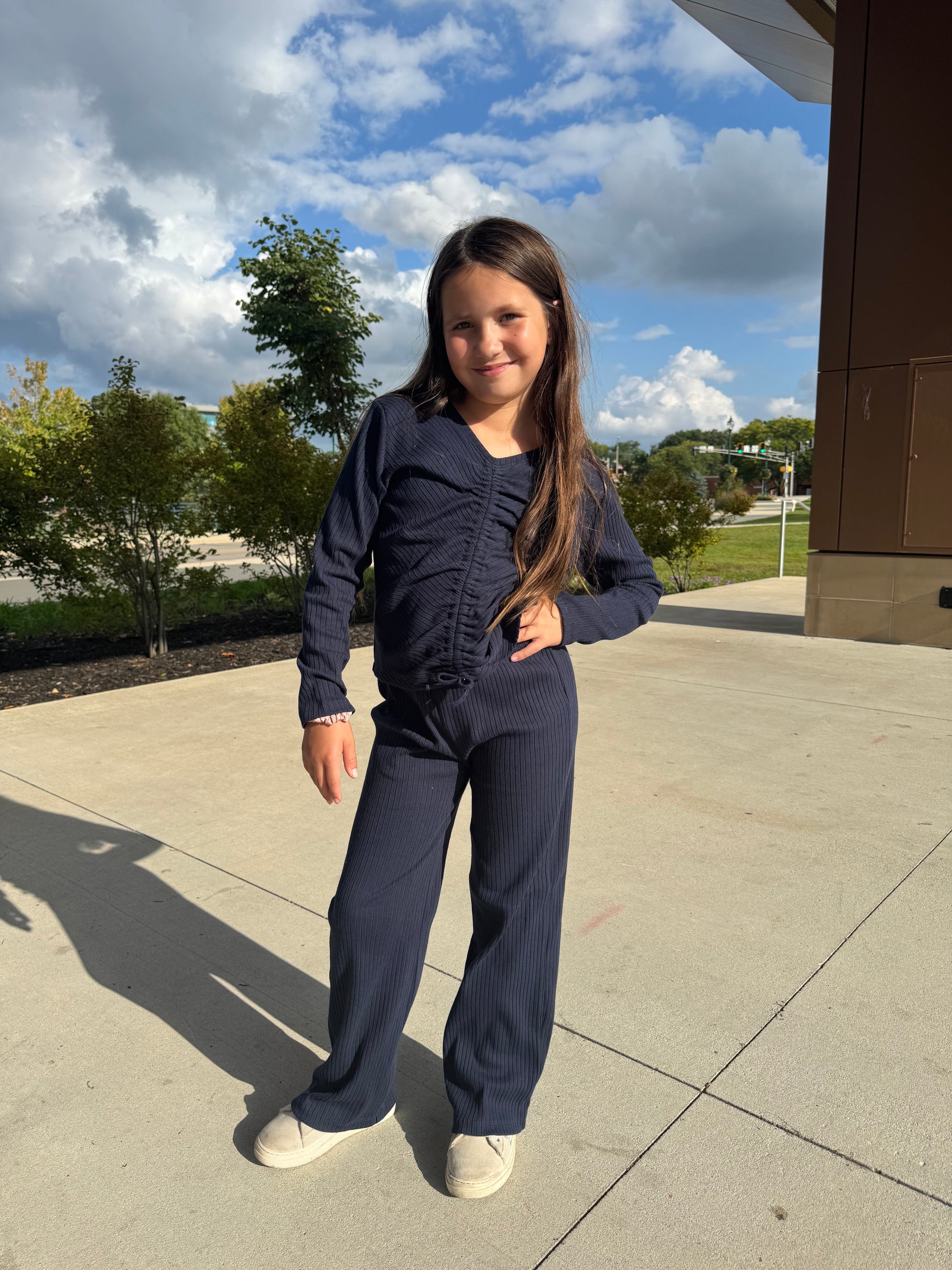 Cozy, cute, and ready for play—the Bluebell Ribbed Set is the perfect outfit for your little girl or toddler. Designed in a soft ribbed knit with a gentle stretch, this two-piece set features a ruched long-sleeve top and wide-leg bottoms for effortless style and comfort. The deep blue hue makes it easy to mix and match with other favorites, while the coordinated design creates an instantly polished look. Whether she’s heading to preschool, playdates, or lounging at home, this set keeps her looking sweet and feeling comfy all day long.