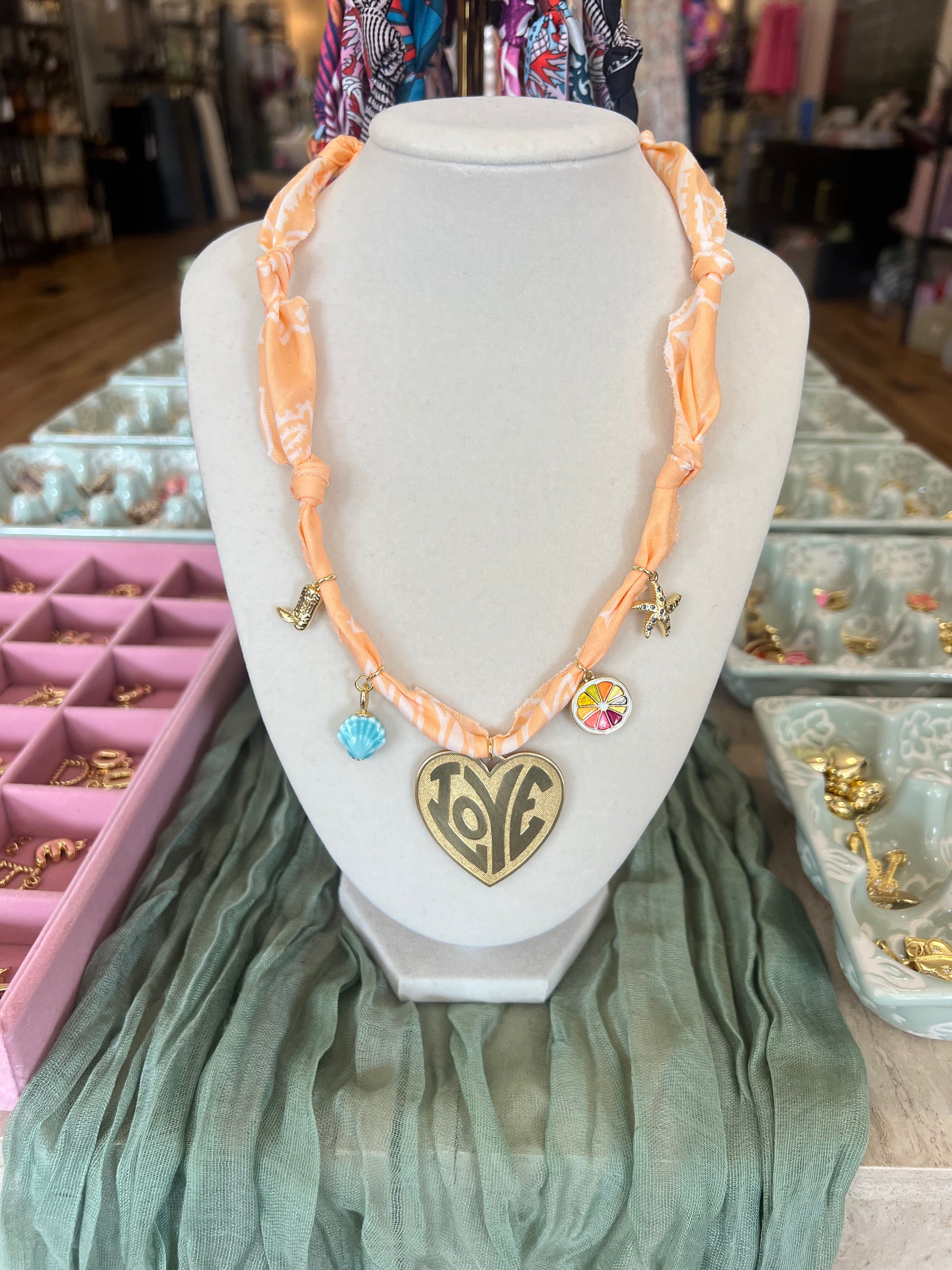 Add a splash of personality and style to your accessories with our handcrafted custom banded jewel necklace. This unique piece combines a soft, peach-toned pattered fabric band with playful, golden charm accents to create a relaxed yet eye catching look.