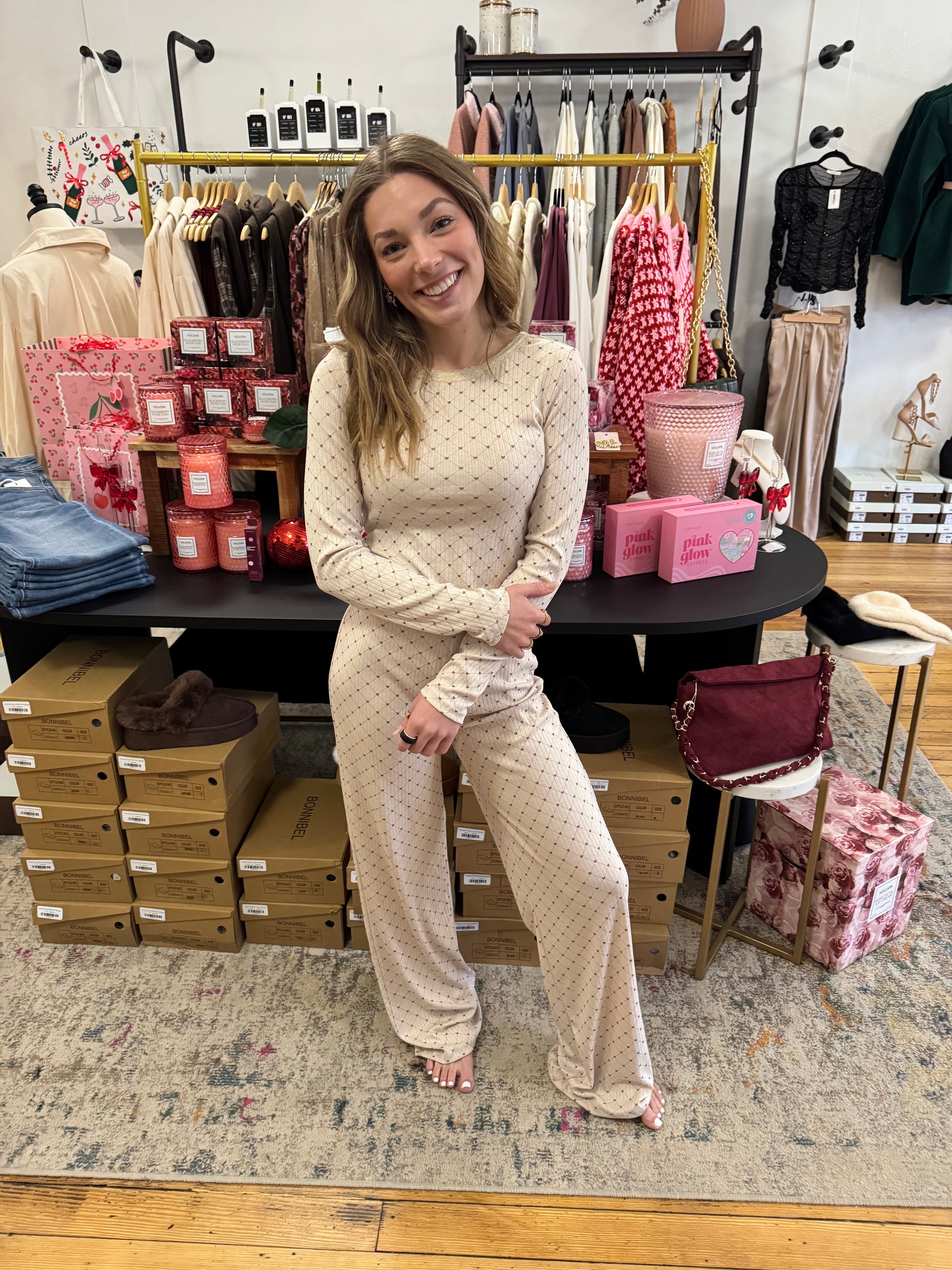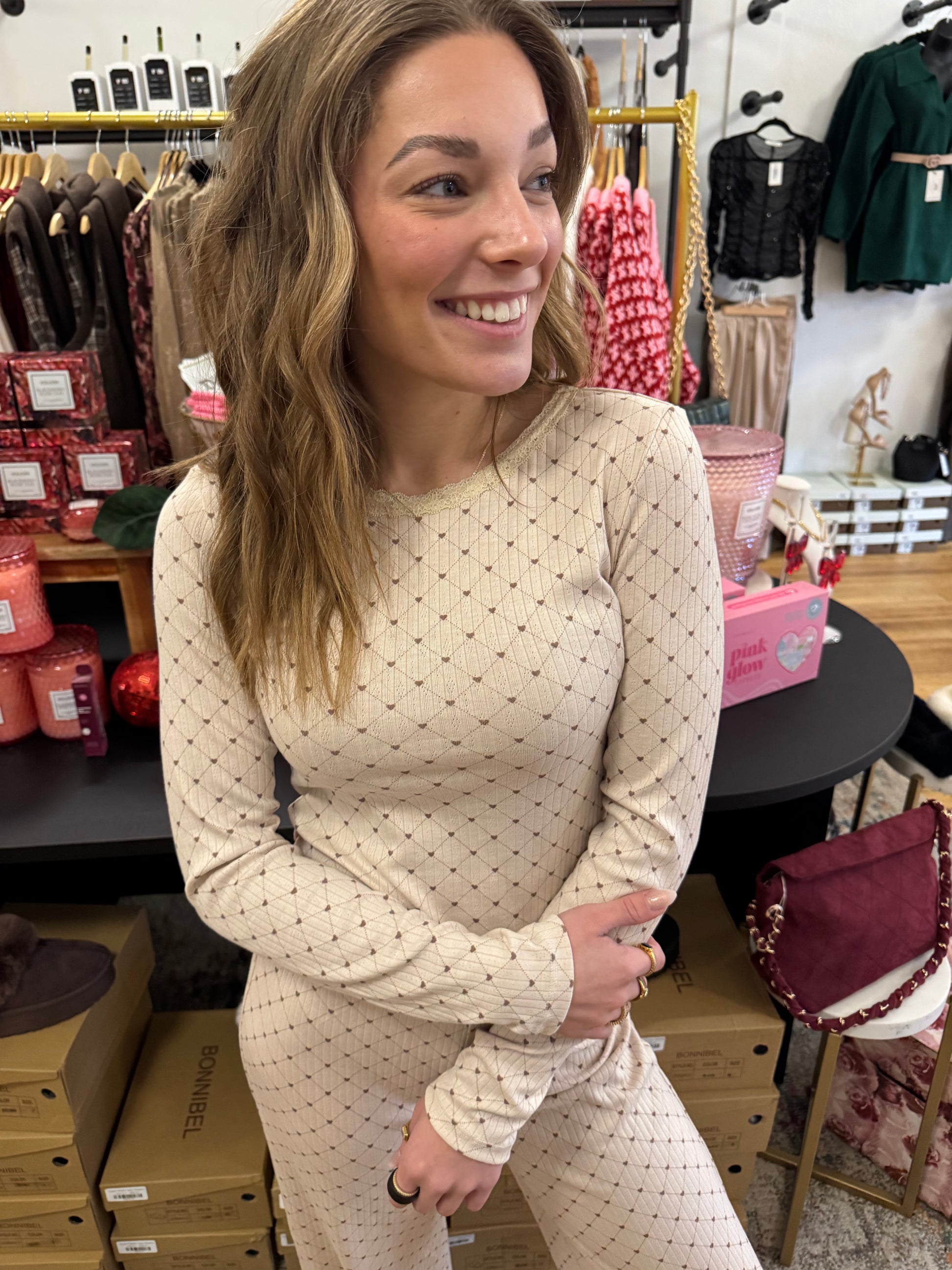 Soft, romantic, and effortlessly comfortable. The Amour Pointelle Set features a fitted long-sleeve top paired with relaxed straight-leg pants, both crafted from a lightweight pointelle knit with a delicate allover pattern. Feminine trim details add a subtle vintage touch, while the stretchy, breathable fabric keeps it comfortable for lounging, sleeping, or slow mornings at home. Designed to feel cozy yet polished, this set is one you’ll reach for long after Valentine’s Day.