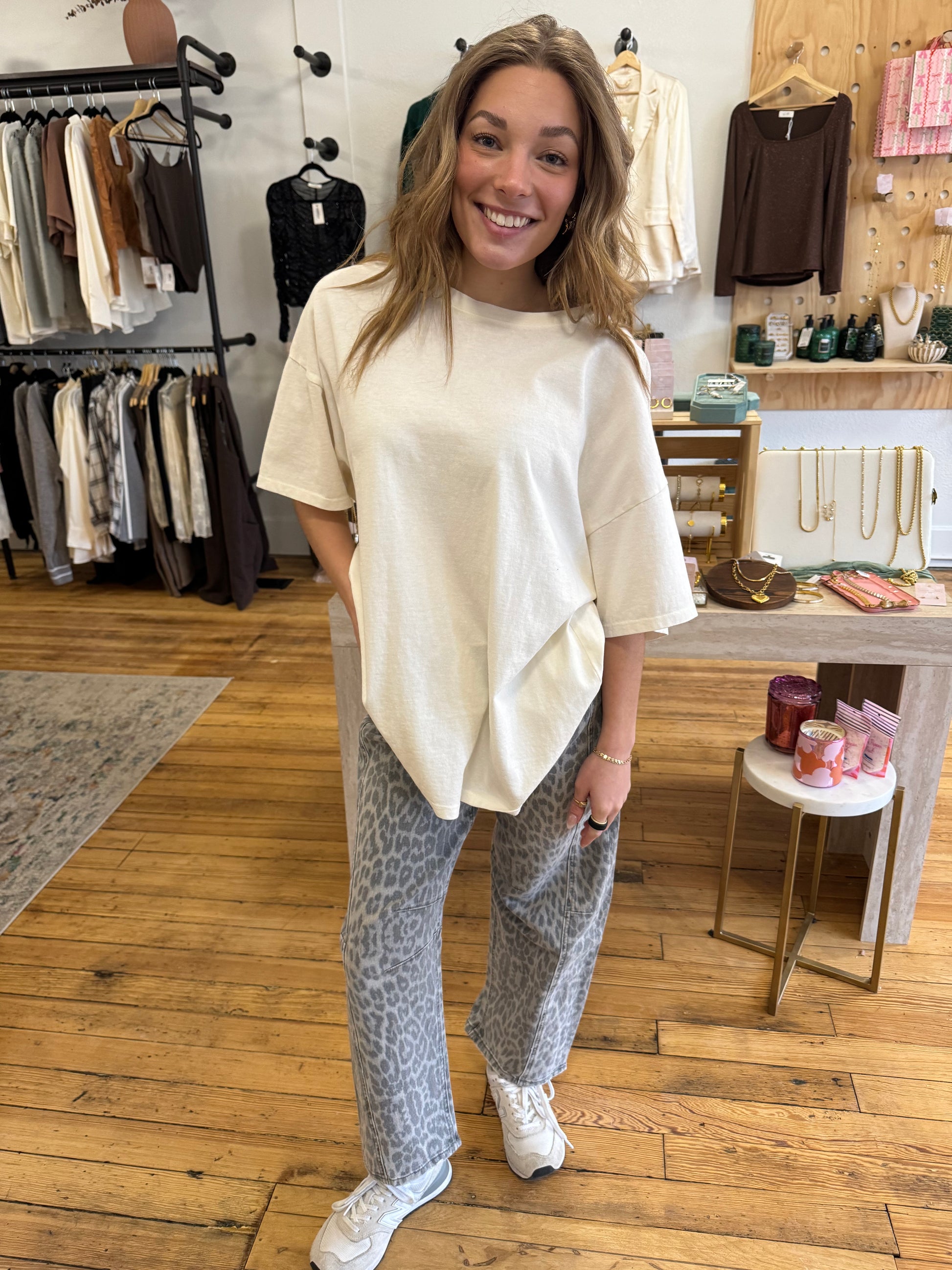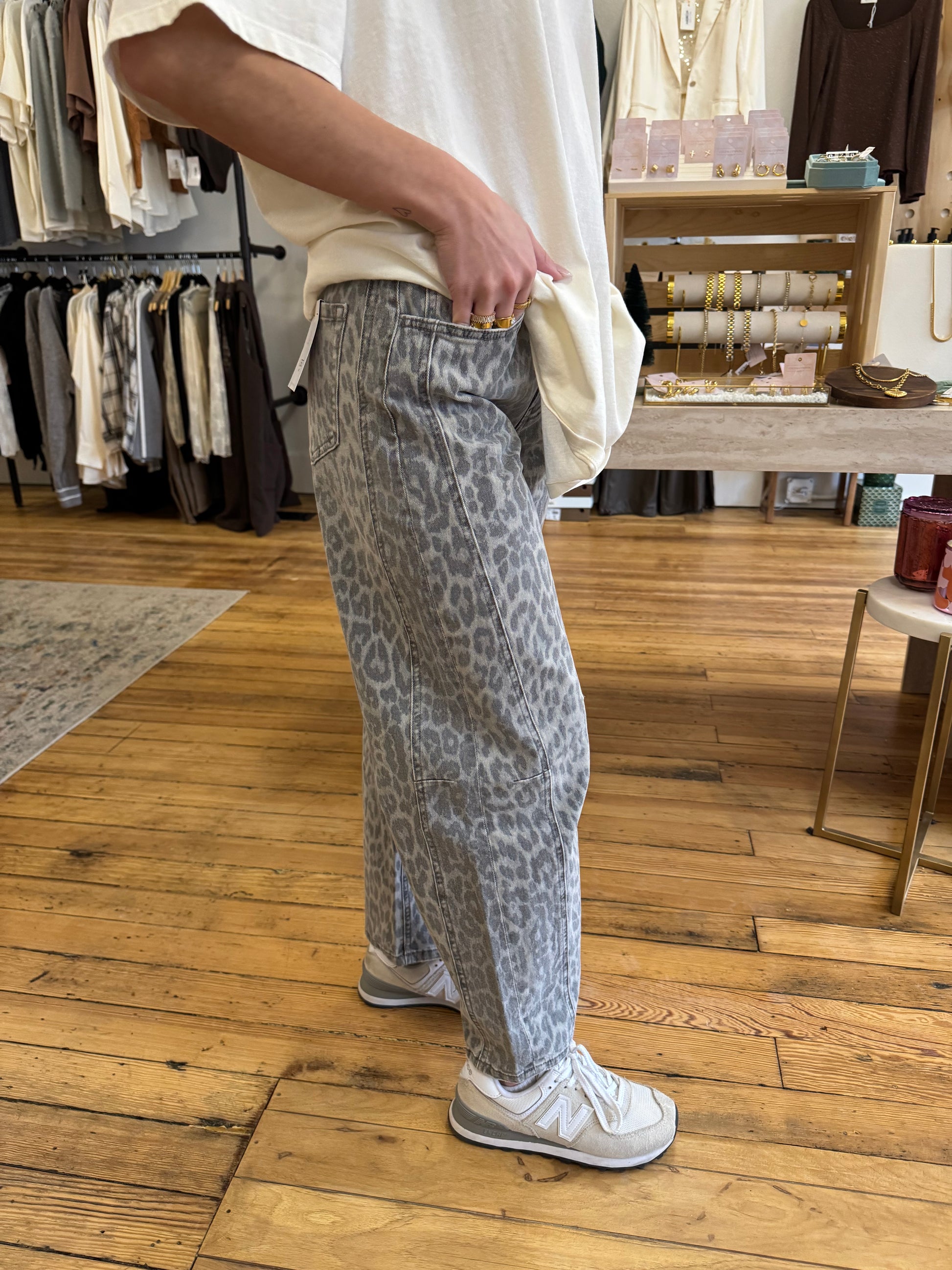 The Kate Barrel Jean brings an effortless edge to everyday denim. Designed with a relaxed barrel-leg silhouette, these jeans feature a soft, lived-in grey leopard wash that feels bold yet wearable. The mid-rise fit sits comfortably at the waist, finished with an adjustable drawstring detail for a casual, laid-back touch. Subtle seam detailing adds structure while keeping the look modern and easy.