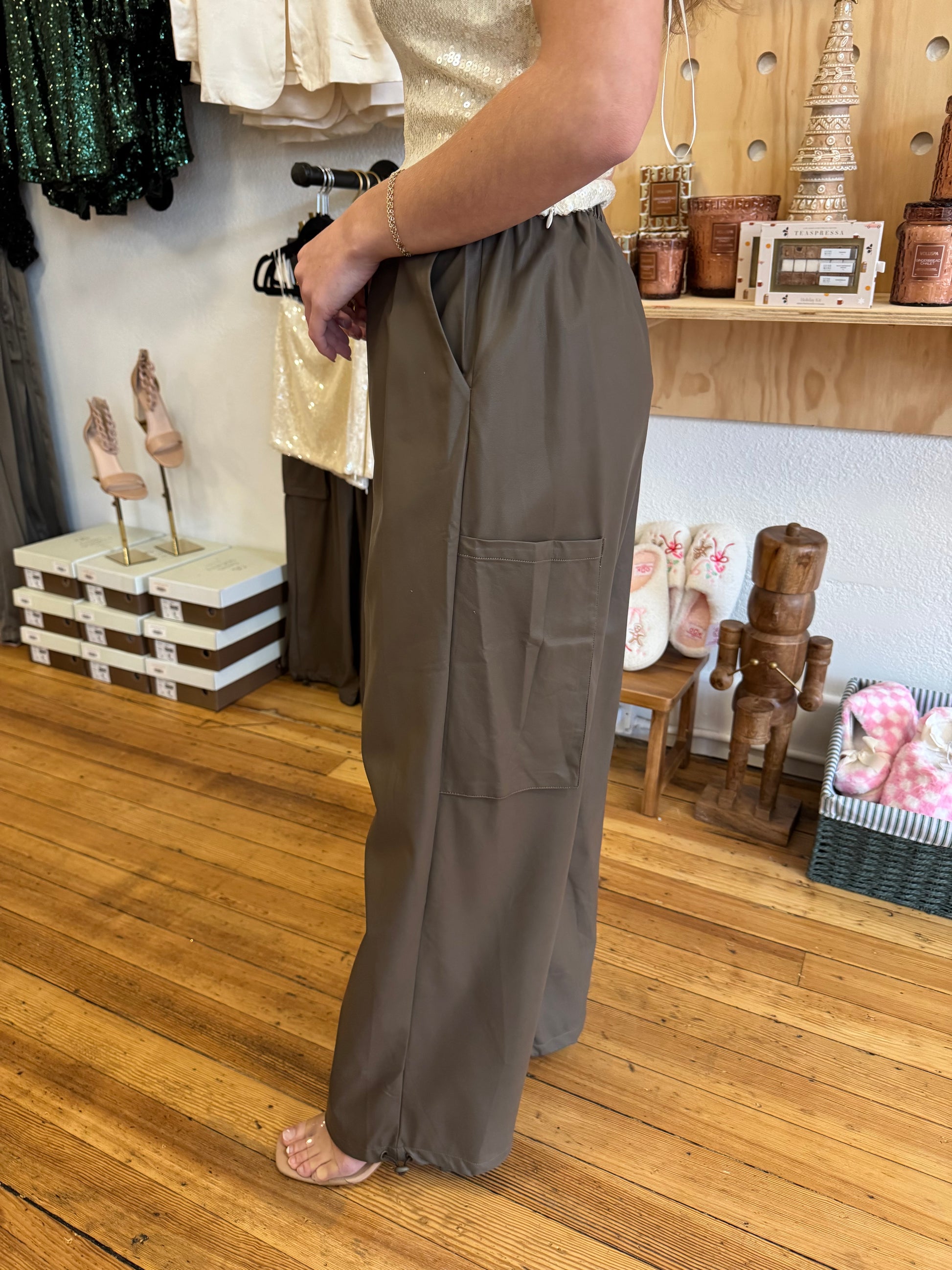 Meet the Holly Luxe Cargo Pants—your new statement piece for holiday nights out. These rich, deep-mocha faux-leather cargos bring the perfect blend of edgy + festive with their glossy finish, wide-leg silhouette, and elevated utility pockets. The adjustable drawstring waist keeps them comfy for long holiday events, while the luxe sheen makes every outfit feel intentional and winter-chic.
