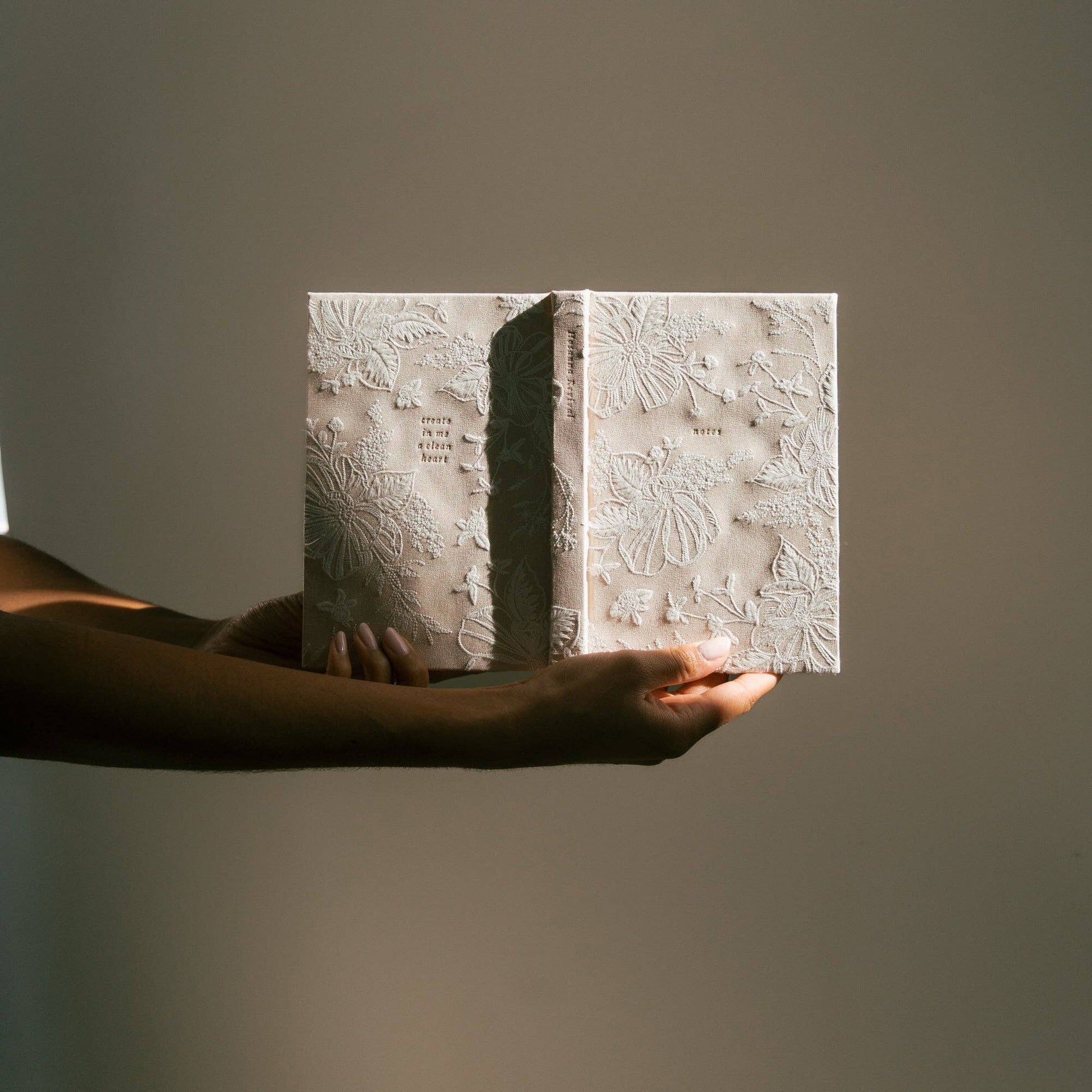 This beautiful notebook features our Casablanca design. Inspired by the town of Casablanca, Morocco, this notebook has a gorgeous, lacey, embroidered floral design, reminiscent of the rich heritage of this town’s textile port. Outlines of delicate, white embroidered magnolias cover this notebook, giving it an elegant and elevated look, while gold-gilded pages give this notebook an extra touch of beauty. The back of this beautiful notebook features a gold-foiled verse, Psalm 51:10, “Create in me a clean heart.” This verse serves as a reminder that when we commune with God, we should desire to be refined by his love and grace.