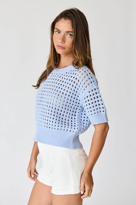 Breezy and bold this open knit cropped sweater adds instant edge to any look The airy weave keeps it lightweight and breathable while the ribbed hem and neckline bring structure Pair it with high waisted bottoms or layer it over a bralette for an effortless trend forward style