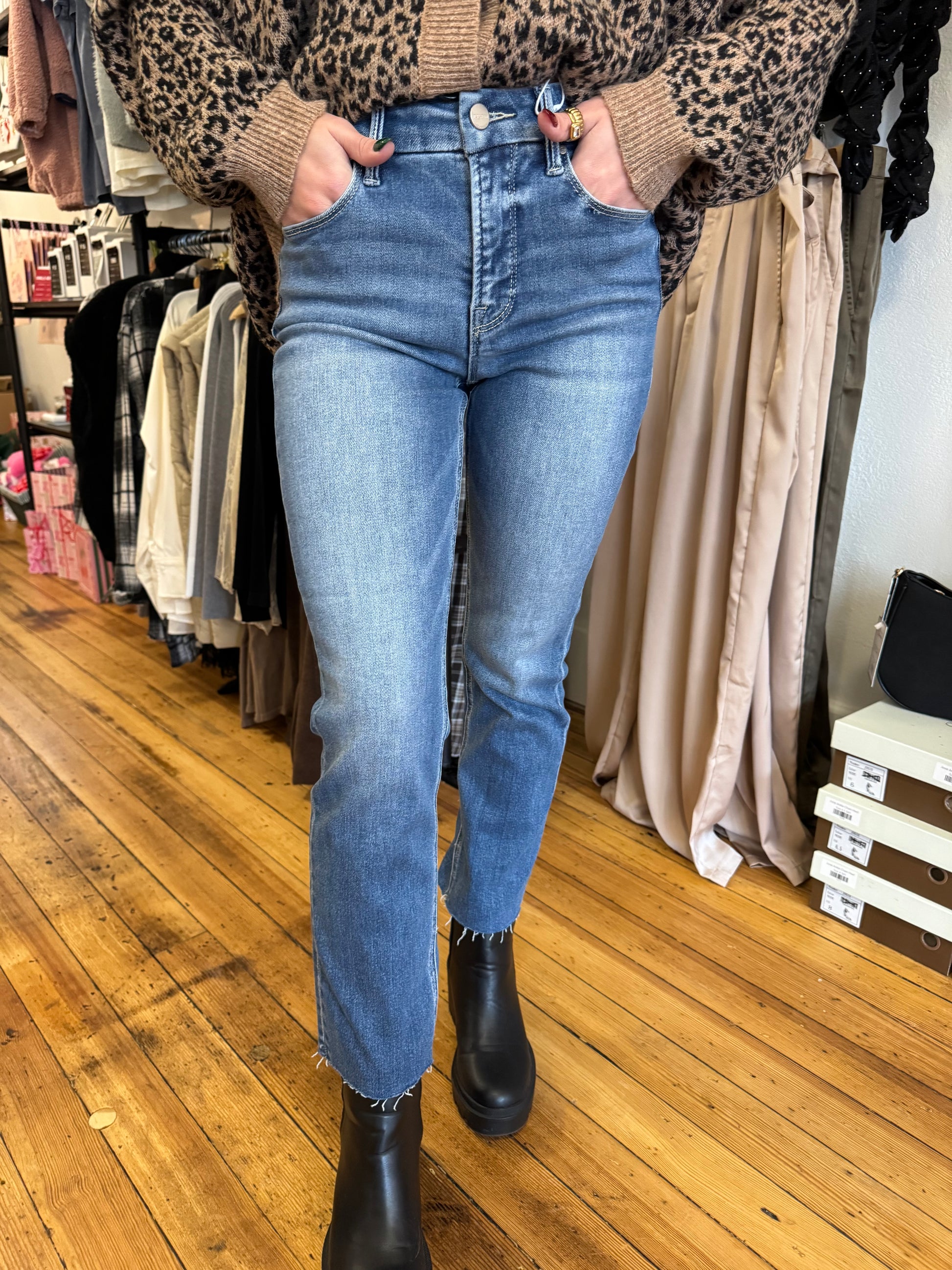 The Sienna Straight Crop Jean is your go-to denim for effortless, everyday style. Designed with a flattering high-rise waist and a clean straight-leg silhouette, these jeans hit at the perfect cropped length with a subtle raw hem for that laid-back, lived-in feel. The medium wash makes them endlessly versatile—easy to dress up with heels or keep casual with sneakers or sandals.