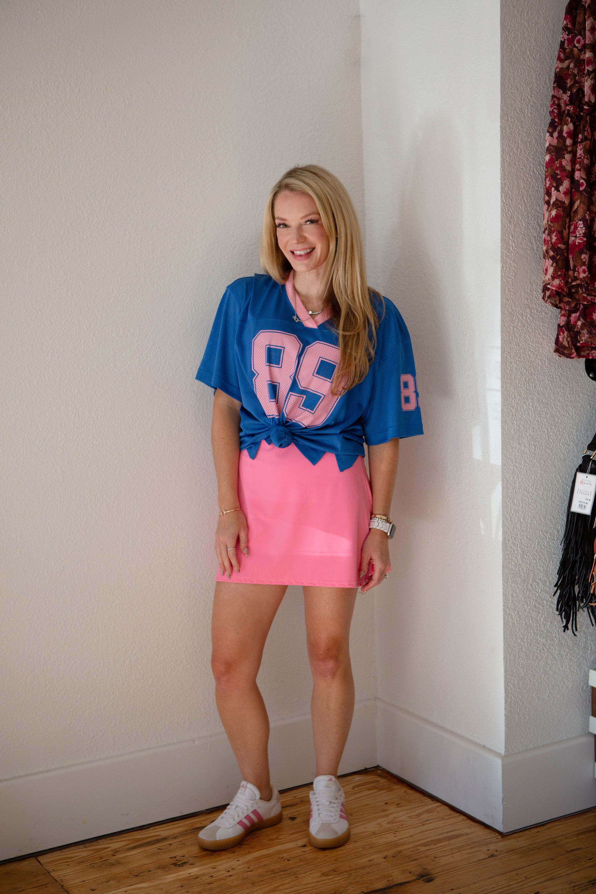 Level up your sporty-chic vibes with the Blue Rush Jersey. Featuring a bold electric blue base, bubblegum pink accents, and oversized “89” graphics, this piece blends vintage athletic energy with a playful twist. Its relaxed fit makes it perfect for layering over lace, denim, or biker shorts—whether you’re stadium-bound, styling a streetwear moment, or just bringing game-day confidence to your everyday look.