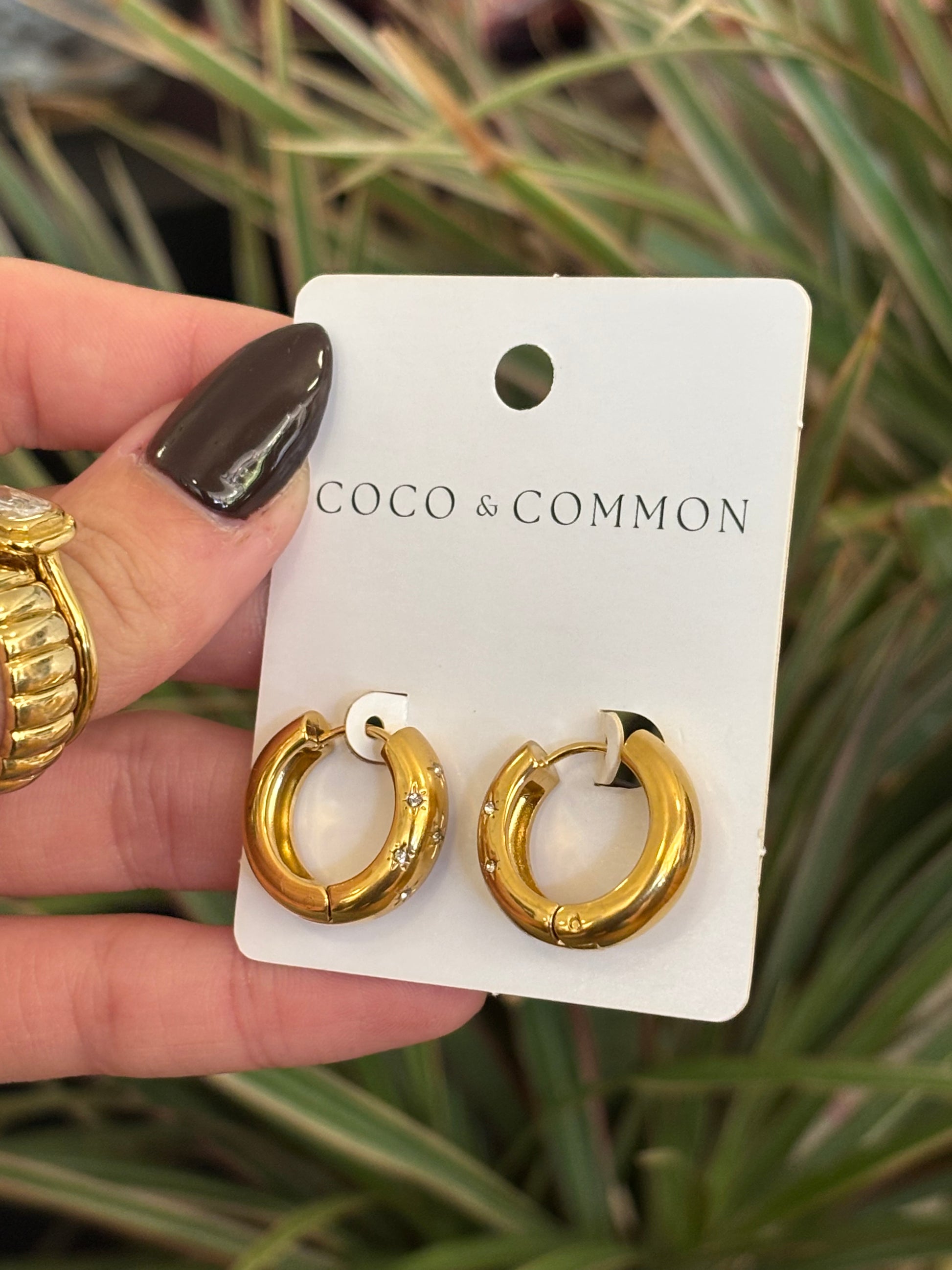 A timeless twist on the classic gold hoop — the Starlit Hoops bring subtle sparkle to your everyday style. These chunky mini hoops feature tiny star-set crystals that catch the light just right, adding a celestial touch without overpowering your look. Perfect for stacking or wearing solo, they’re the effortless blend of bold and polished that you’ll reach for again and again.