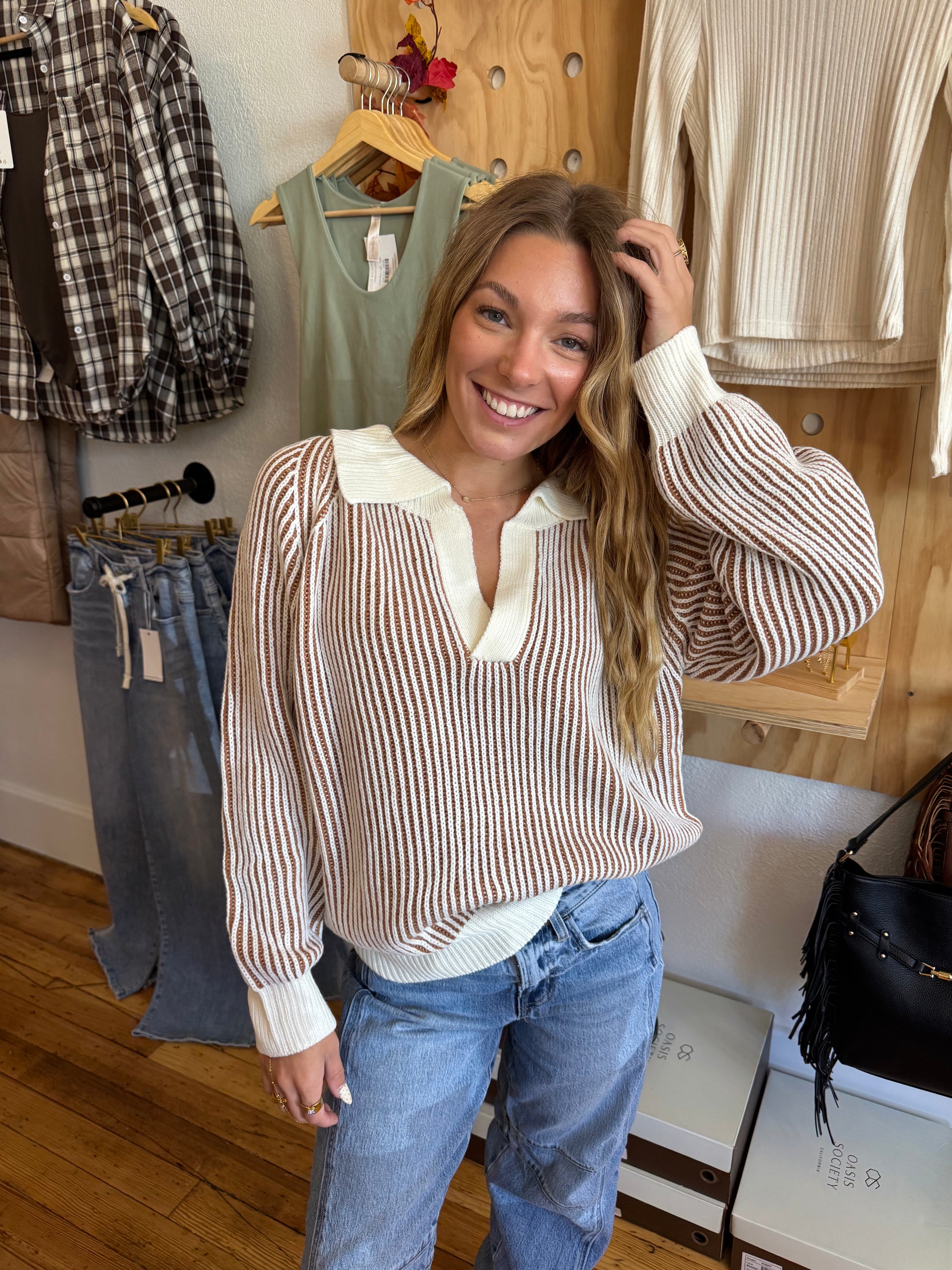Effortlessly chic and endlessly comfortable, the Sundown Stroll Set brings laid-back sophistication to your everyday style. Designed in a soft ribbed knit with warm taupe and cream stripes, this matching top and pant duo is as cozy as it is elevated. The relaxed sweater features a collared V-neckline and cuffed sleeves for a polished touch, while the wide-leg pants drape with ease, offering movement and comfort. Perfect for everything from coffee runs to weekend getaways, this set transitions seamlessly from lounging to street-style. Pair with a wide-brim hat and boots for a western-chic edge, or sneakers for an off-duty vibe.