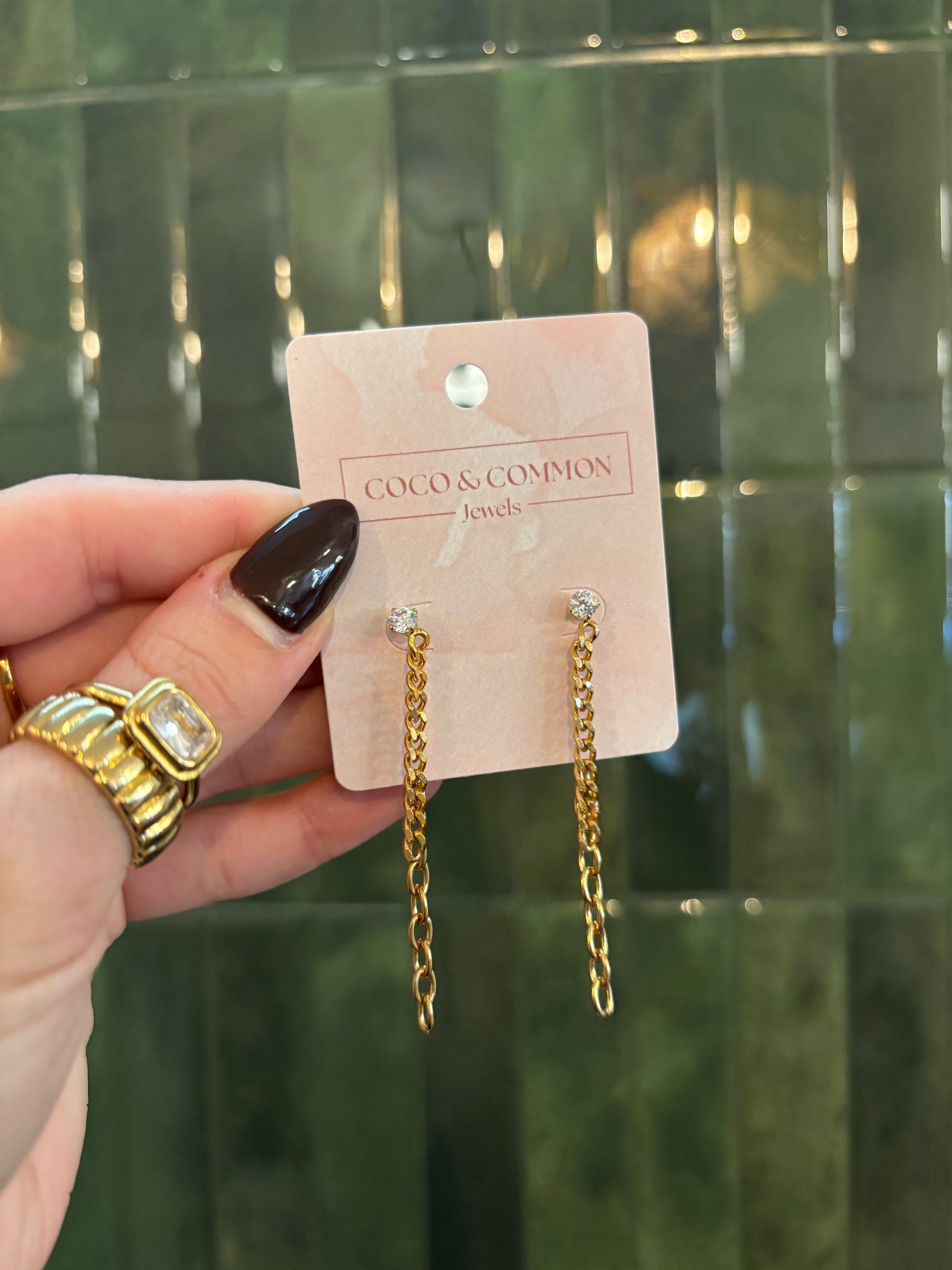 Delicate with a dash of daring — The Elle Drops bring effortless sophistication to any look. Featuring a sparkling crystal stud that cascades into a sleek gold chain, these earrings move with you, catching every bit of light. Perfect for dressing up your basics or adding a subtle edge to your evening wear, they’re the definition of modern elegance.