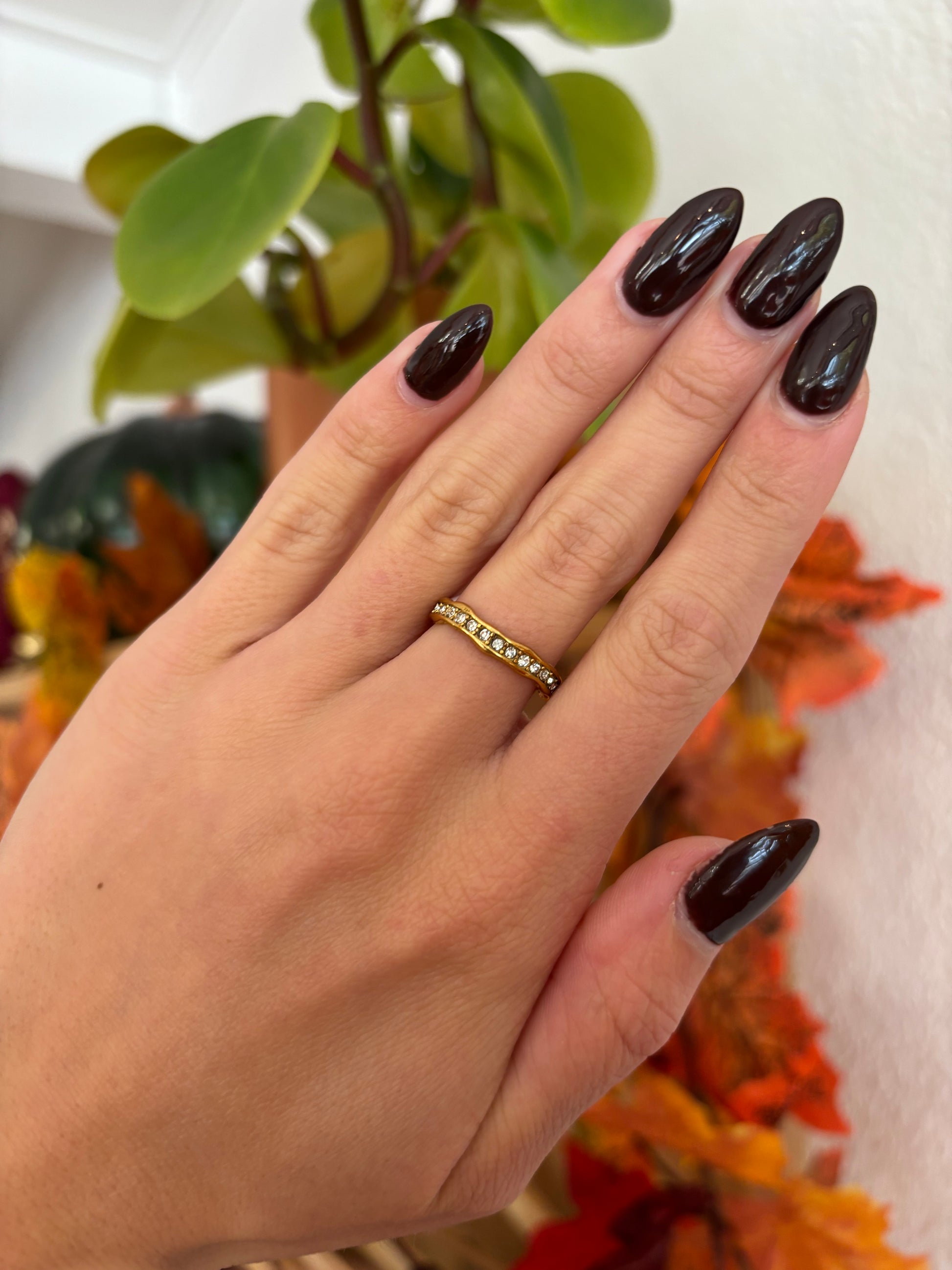 Timeless with a touch of sparkle — The Everly Band is the perfect blend of simplicity and shine. Its delicate gold curve is accented with a row of tiny crystals that shimmer effortlessly with every movement. Designed for stacking or wearing solo, this elegant piece adds just the right hint of luxury to your everyday look.