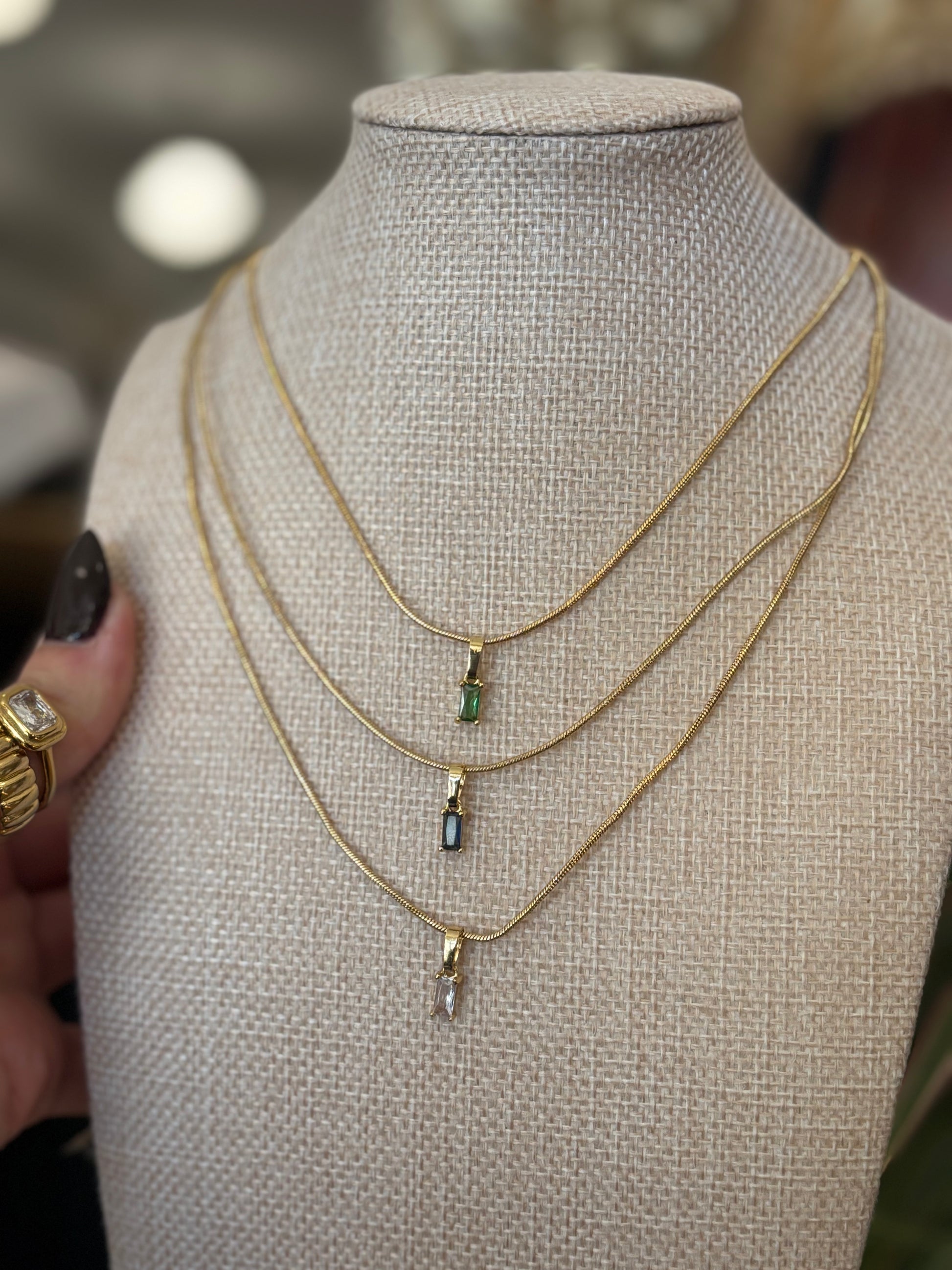 A modern take on timeless elegance — the Lustre Line Collection brings together rich color, clean lines, and golden simplicity. Each necklace features a sleek baguette-cut gemstone that catches the light with every movement, symbolizing confidence, balance, and grace. Whether worn solo or layered together, these pieces create a radiant statement that’s effortlessly refined.