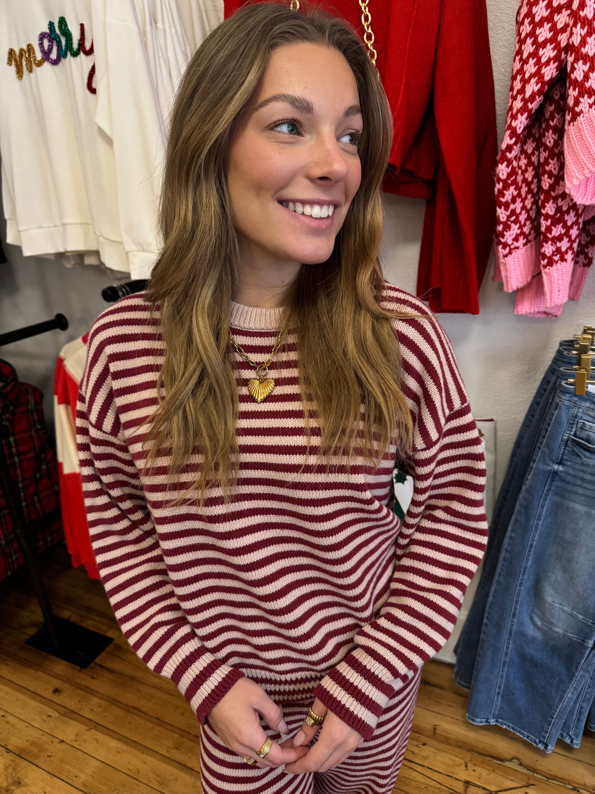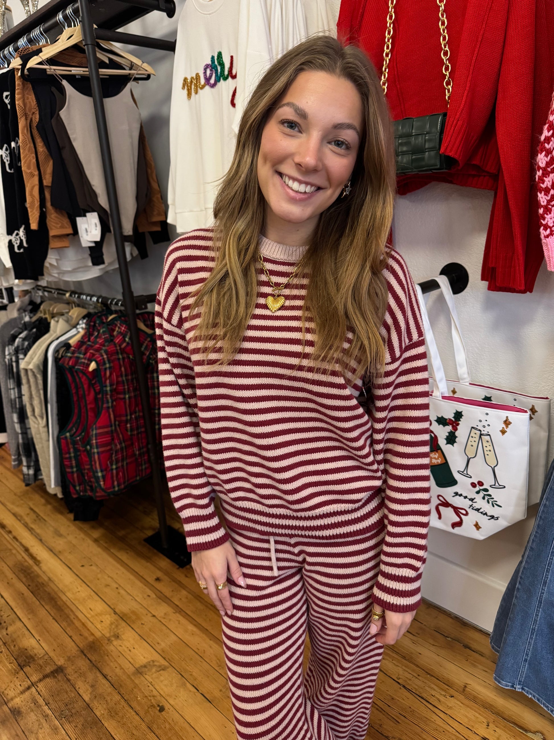 Meet your new cozy-season uniform — The Merry Stripe Lounge Set. This ultra-soft knit matching top and pant duo brings all the warm, festive vibes with its cherry red and cream stripes. The relaxed-fit sweater pairs perfectly with the wide-leg drawstring pants, giving you that effortless “cute without trying” look whether you’re lounging at home, running holiday errands, or grabbing a peppermint mocha.