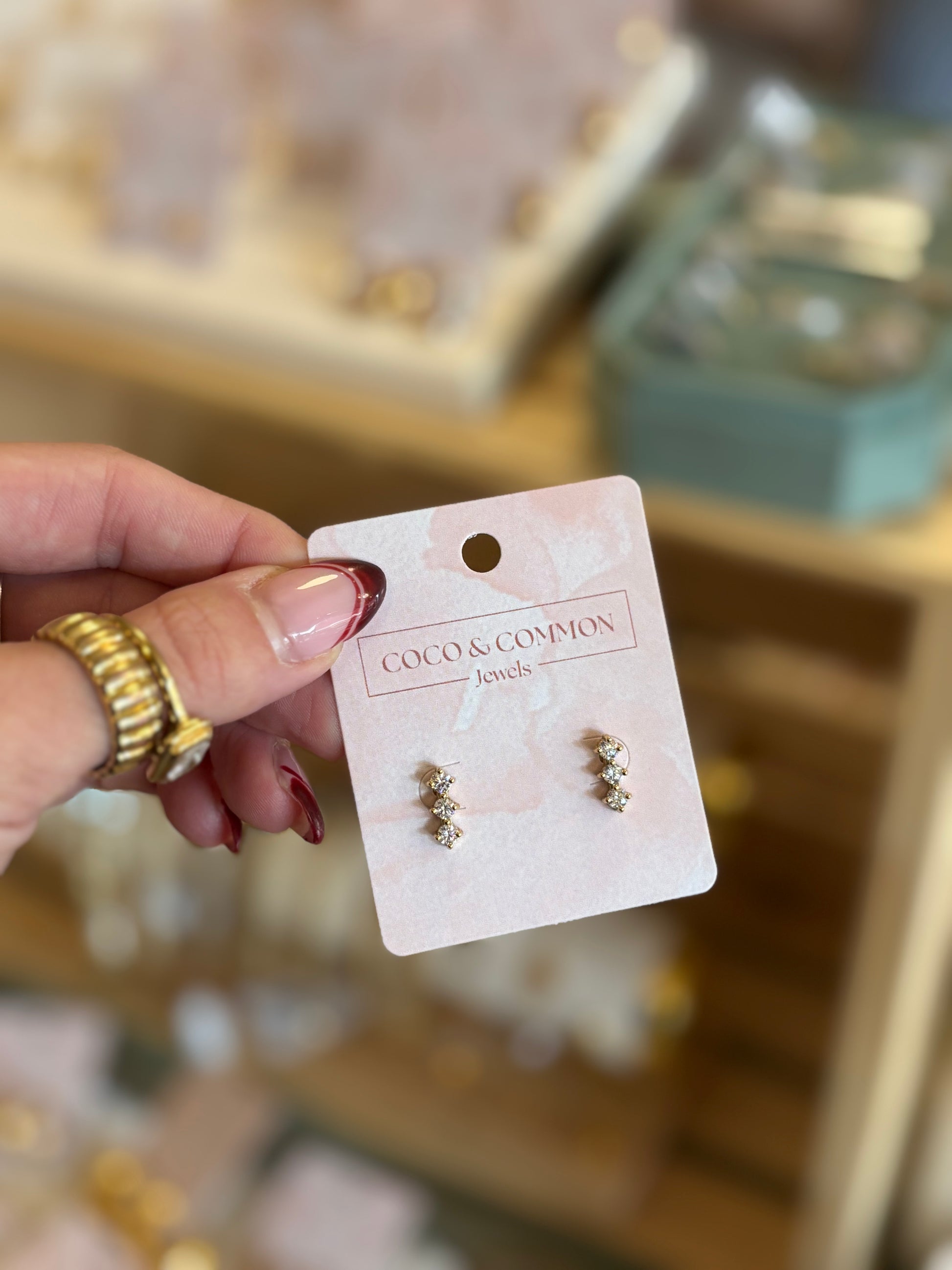 Meet the Twyla Trio Studs — your new go-to sparkle with a soft, feminine twist. Each earring features a cascading trio of petite crystal clusters, catching the light with every turn for a delicate yet elevated shine. Their dainty silhouette makes them perfect for everyday wear, while the stacked design adds just enough glamour for nights out, holiday events, or gifting season.