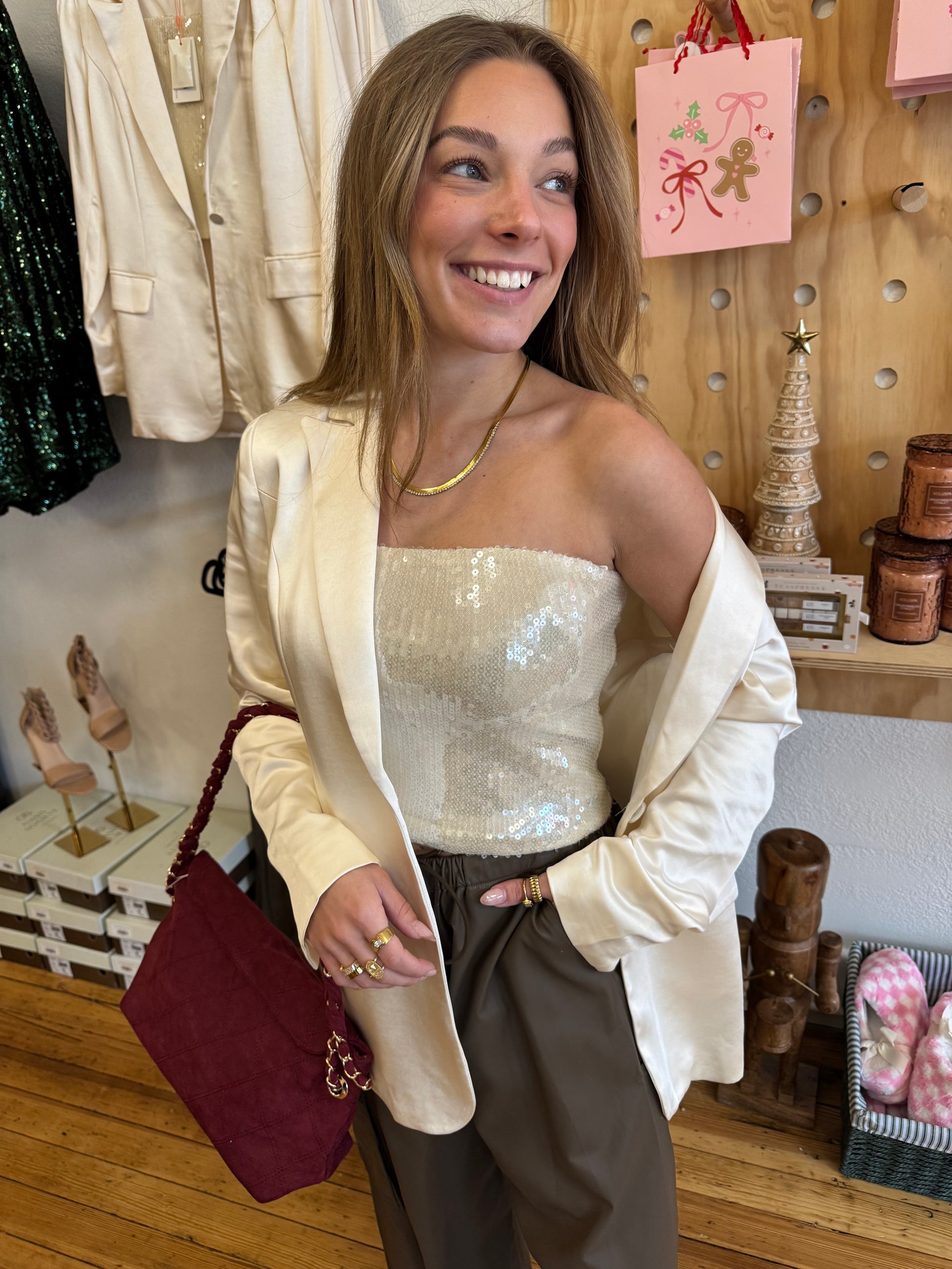 Step into the season with polish and glow. Our Winter Luxe Blazer is crafted in a soft satin-finish fabric that drapes effortlessly and elevates any look. The clean, single-button closure creates a sleek, elongated silhouette while the structured shoulders add just the right amount of confidence. Fully lined for comfort and finished with front welt pockets, it’s the perfect piece for holiday parties, winter weddings, photoshoots, and dressed-up nights out.